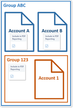 Group ABC contains Account A, Account B, and Group 123, all of which are marked to include in PDF reporting.