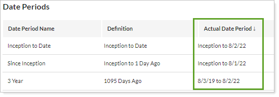 The Actual Date Period column on the Date Periods page lets you view the calendar dates of a saved date period if you used that date period today. This is especially useful for rolling date periods that are relative to today's date, such as the Previous, Inception to Previous, and Previous to Previous date period types. For example, if you set up a 'To Date' period date period for Inception to Date, and the current date was 9/12/2018, the actual date period is Inception to 9/12/2018.
