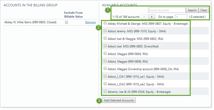 Click Add Selected Accounts. This adds all the accounts you selected to the Accounts in the Billing Group list.