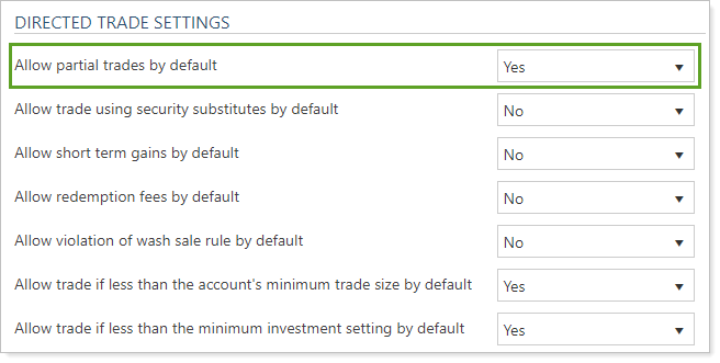 Directed Trade Settings on the Rebalancing System Settings page allow you to change the default trade rules you see when you work with directed trades. The Allow partial trades by default option controls the default setting for the Allow partial trades trade rule within a directed trade.
