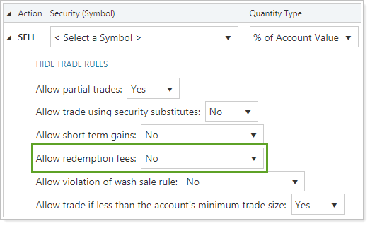 Use Account Setting: Trades created in accounts that allow redemption fees will be allowed to make trades that generate redemption fees, but won't be allowed in accounts that do not allow redemption fees.