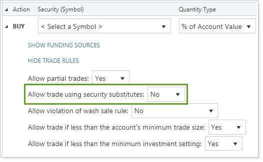 When placing a directed trade for a security with security restrictions, Tamarac Trading can perform the trade action using substitute securities if substitutes are available for the security and you have selected Allow trade using security substitutes.