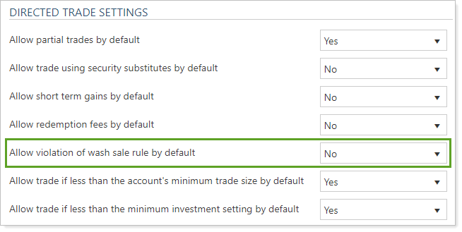 Yes: In a directed trade, Tamarac Trading will default to Yes which means that trades generated that produce a wash sale violation will be allowed, regardless of whether an account allows for a violation of the wash sale rule or not.