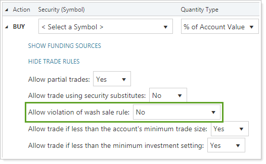 Use Account Setting: Trades that violate the wash sale rule will be allowed in accounts that allow the violation of the wash sale rule, but won't be allowed in accounts that don't allow for violation of the wash sale rule.