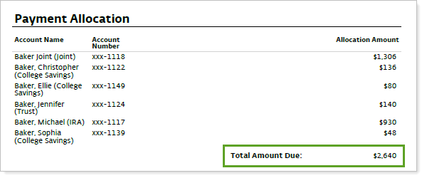 When you select Always show totals row, a total row is added to any Billing Definition, Payment Allocation, or Billing Allocation sections included in the PDF template Billing section.