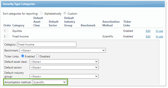 Use this category type setting to determine the amortization method used for debt securities. Amortization method is used in the Amortization and Accretion report calculations, and it impacts cost basis calculations, which you see throughout Tamarac.