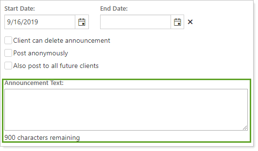 Use this announcements setting to type the text you want to appear on the announcement on the client portal.