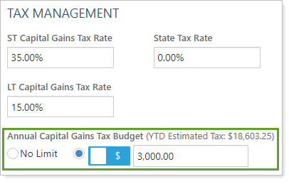 Use this account setting to set a maximum allowable amount of annual capital gains tax for the account or group. This setting uses the ST Capital Gains Tax Rate and LT Capital Gains Tax Rate fields to estimate the year to date taxes incurred by the annual short-term and long-term gains and by the proposed rebalance. Configuring this setting to create an annual capital gains tax budget will not prevent a rebalance if the budget is exceeded; it just provides a way to track the budget and see warnings to help you make tax-aware investing decisions.