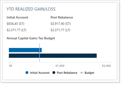 On the Rebalance Summary, you can view the value entered in this setting to initial and post-rebalance capital gains tax values in a chart. You'll be able to see this for rebalanced taxable accounts and groups that contain at least one taxable account.