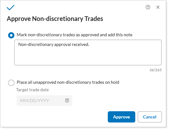 Selected: Trades in non-discretionary accounts must receive trade approval before they can be sent to the Trade List. When a trade is recommended in a non-discretionary account, the approver must add an account note before the trade is sent to the Trade List.