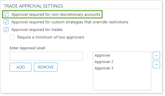 Trade Approval Settings allow you to enable trade approvals and set additional rules about which trades require approval and who can approve those trades. Approval required for non-discretionary accounts dictates the kind of approval required to approve trades within non-discretionary accounts. Once approved, trades go to the Trade List before being completed.