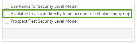Submodels and Security Level models are not typically assigned to groups or accounts. In order to shorten this list, edit the Allocation model or Security Level model and clear the Available to assign directly to an account or rebalancing group check box to reduce number of model options you see listed.