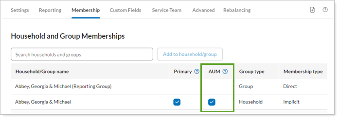 The Household and Group Memberships panel shows group, account set, and Household memberships, but AUM can only be selected for a Household membership.