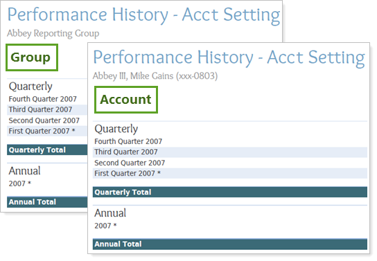 Account Setting:Displays values based on the configuration of the account and group Use fiscal year end for the Performance History report check boxes.