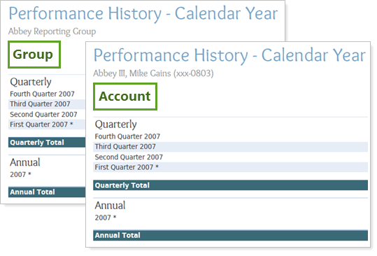 The Performance History report allows you to calculate returns based on the year end designated in the account or group settings. This setting allows you to designate what year-end date is used for those calculations in the event that an account has a different fiscal year end from the rest of the group.