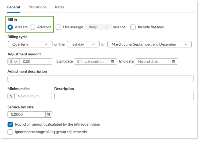 This setting allows you to determine whether a billing definition is billed in arrears or advance.