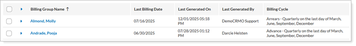 For example, the billing cycle is set to Arrears - Quarterly on the last day of March, June, September, December. Only billing groups with this billing cycle set are displayed.