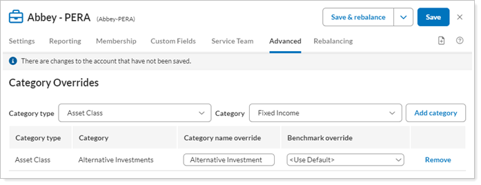 Category allows you to select the specific category you want to override within the specific account or group. This field appears after you select a Category type in the Category Overrides panel. The Category Overrides panel lets you rename categories specifically for individual accounts or groups, and changes made on this panel will only show on that account or group's reports. This lets you change a individual client's category name from Equities to Stocks, for example, if that's their preference.