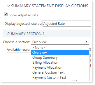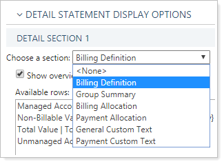 This billing statement setting allows you to choose what section to add to the billing statement. This allows you to customize statements to show exactly the sections you want, in the order you want. You'll see this list available for both the Detail Statement Display Options and Summary Statement Display Options sections on the billing statement.