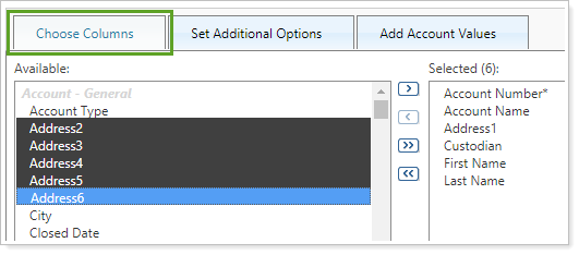 Use this bulk report tab to add or remove columns from the report. Columns marked with an asterisk (*) are required and cannot be removed.