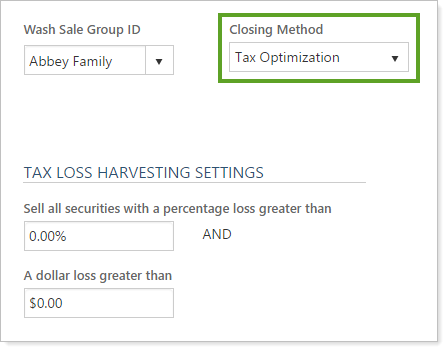 When using a tax loss harvesting rebalance option—the Tax Loss Harvesting & Rebalance and Tax Loss Harvesting Rebalance rebalance types—the closing method used will automatically be Tax Optimization, regardless of the setting chosen.