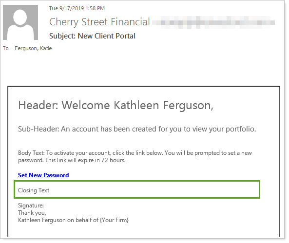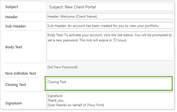 Closing Text In the email template: