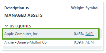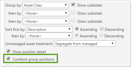 You will most likely use this if you report at the group level and want to see data broken down by position rather than account. This is especially useful if you trade accounts together, as it displays holdings for the combined accounts. You may also find it useful for evaluating unrealized gain/loss reports by client.