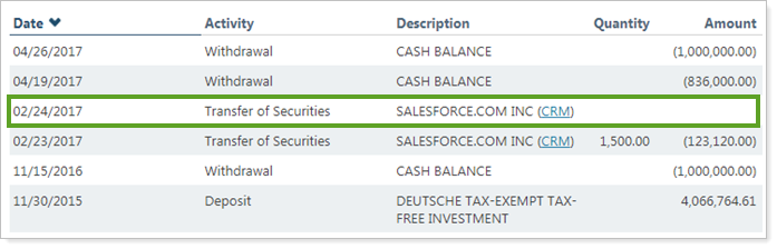 In this example, a transfer on 02/24/2017 contained five lots of the same security. With the Combine transfer lots check box selected, all five lots are combined into one line item.