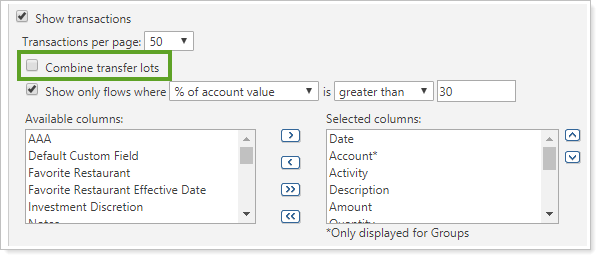 You may have one transfer that includes multiple lots of a security. In this case, this setting allows you to either roll all the lots up into one transfer record, or break out each lot as individual transactions.
