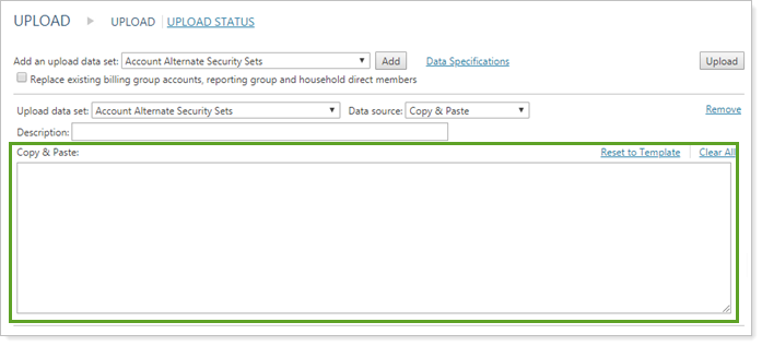 Use this upload setting if you have your data in a spreadsheet. Copy from the spreadsheet or file and paste it directly into the Copy & Paste box.