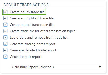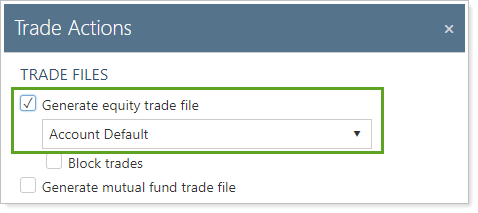 The Trade Actions dialog allows you to select your trading options before sending trades for execution. When selected, Tamarac Trading will select Generate equity trade file by default on the Trade Actions dialog. You can still clear this check box before creating orders to send to the custodian.