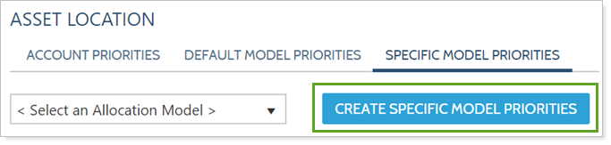 Specific model priorities override default model priorities and can accommodate priority changes for some circumstances. Create Specific Model Priorities opens a dialog where you can select an individual allocation model and prioritize that model differently for the selected asset location preference label or labels.