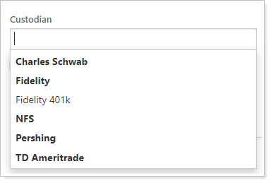 If you plan to participate in an integration such as Schwab OpenView Gateway, be sure to designate the correct custodian. All custodians that are linked to a custodial integration appear in a bold font. This way, you won't need to know whether you should choose Fidelity or Fidelity 401k—just choose the custodian that's in a bold font.
