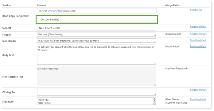 Use this email setting to designate one or more individual email addresses where you want a blind carbon copy (BCC)of the automated email sent. This allows you to BCC specific people within your firm when a certain template is used. For example, if one person is always in charge of helping clients manage passwords, you can add that person's email address to the password-related email templates.