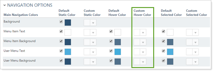 This setting allows you to customize the menu item background color when a user hovers the mouse over that menu item. For more information on using the default color, see Default Hover Color.