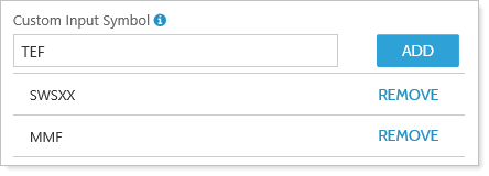 Custom Input Symbol allows you to map the selected security to an alternate symbol. This can be used to map liquid investments to cash ($$$), map securities to a dummy ticker, or map an unrecognized symbol to an alternate symbol.