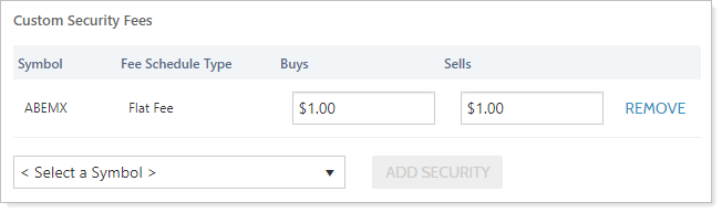 If your custodian has different fees for buys and sells of specific securities using a flat fee schedule, you can set up those fees under Custom Security Fees.