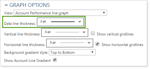 This site theme setting allows you to define the thickness, in pixels, for the data lines in your reports. This setting is only available for the Account Performance line graph.