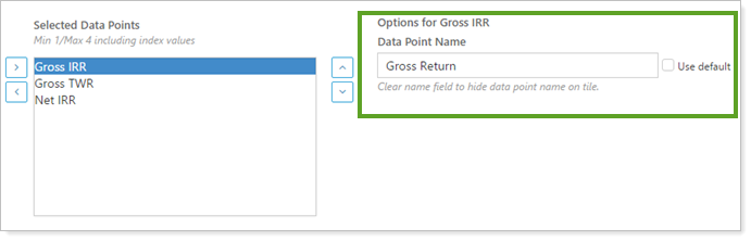 These client views dashboard tile settings determine the tile name displayed on the dashboard tile that the client sees. You can rename any tile. For example, a data point is called Gross IRR, but clients won't know what IRR is. You want to change the name to simply display Gross Return.