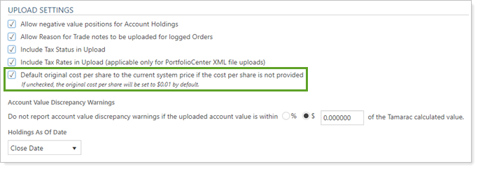 Upload Settings on the Rebalancing System Settings page allow you to change how Tamarac Trading treats some of the information you add through upload. The Default original cost per share to the current system price if the cost per share is not provided option lets Tamarac Trading know how you'd like to tread original cost per share on securities when none has been provided.