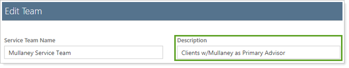 This service teams setting, sometimes called Team Description, allows you to optionally add a description for your firm's service teams. The Description field is available when you create or edit a service team. It is not client-facing and can be used to add in additional information that would be helpful to differentiate it from other tiles used in your firm.