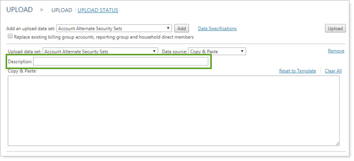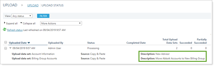 For example, if you upload a data set that updates the primary advisor and at the same time upload a data set to adjust billing group account membership, the description can help you identify which is which.