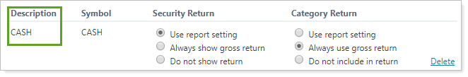 This Cash setting column displays the name of the security. This comes from the security's Description.