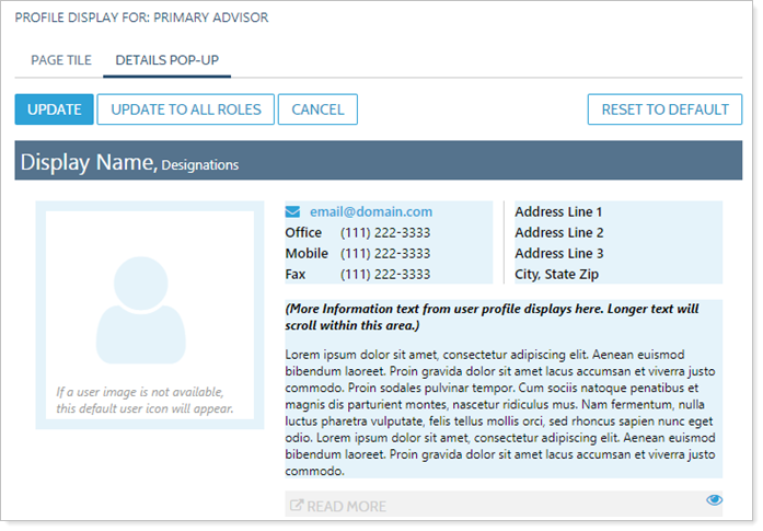 Use the client view Service Team settings available under the Details Pop-Up tab to customize the details displayed when a client clicks the View Details button on a service team member's profile.