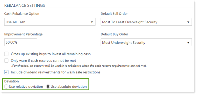 Rebalance Settings on the Rebalancing System Settings page allow you to customize how Tamarac Trading adheres to logic during a rebalance and how it calculates information during that process. These settings are widely applicable to many different rebalance types. Deviation controls how Tamarac Trading calculates deviation away from model targets.