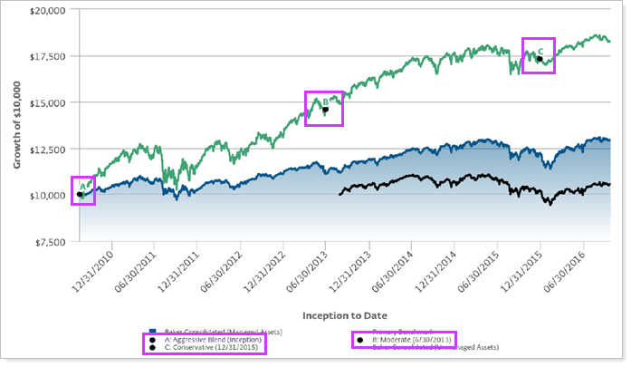 On PDF line charts, Tamarac marks changes to benchmarks with letters. The legend tells which benchmark corresponds to each letter and the date range for how long the benchmark applied.