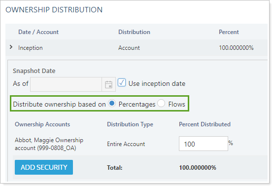 For example, use flow-based distributions if you have an LLP account with two partners. If one of the partners contributes more than the other, you can enter the amount of flows contributed by each and Tamarac Reporting will calculate what percentage of the total each partner gets.