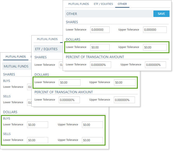 Reconciliation tolerances are used in automatic reconciliation and serve as thresholds when comparing your trade orders with the actual trade executions from your portfolio accounting system. Dollars lets you set an upper and lower threshold when Tamarac Trading compares the dollar value of the orders you create to the actual trade executions.