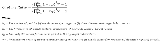 Upside capture ratios for funds are calculated by taking the fund's daily return during days when the benchmark had a positive return and dividing it by the benchmark return during that same month. Downside capture ratios, however, are calculated by taking the fund's daily return during the periods of negative benchmark performance and dividing it by the benchmark return.