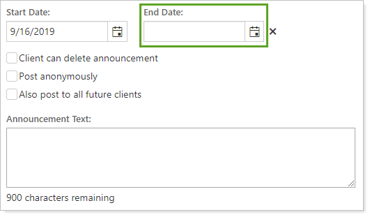 Use this announcements setting to set when the announcement will stop being displayed on the client portals. If you leave this field blank, the announcement will stay up until the client manually removes it, if you select Client can delete announcement. In most cases, it's best to specify an end date.